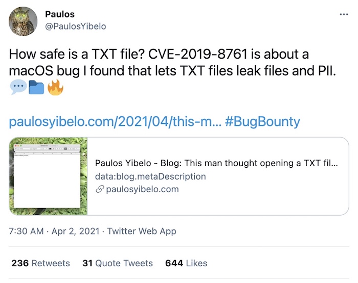 Great work by @PaulosYibelo, who found that macOS text editor TextEdit parses HTML even when it opens it as a .TXT file. That allowed him to remotely run code on a victim's machine.