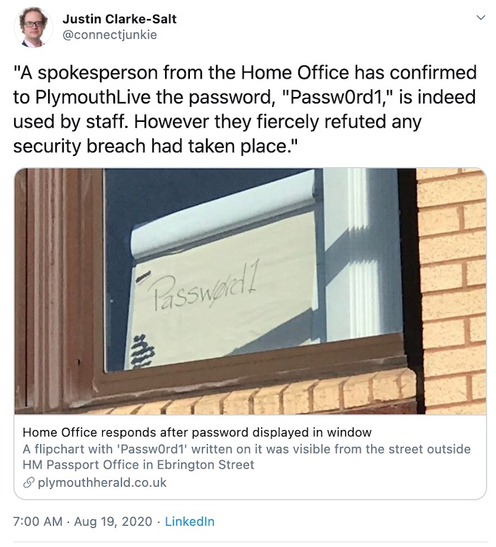 Justin Clarke-Salt: The U.K. Home Office, responsible for all of U.K.'s domestic affairs, confirmed that a flip chart with "Passw0rd1" written in big letters and visible from a window was, in fact, a password used by staff at the government department. But, the Home Office "fiercely refuted" that a breach had taken place. I'm just amazed Armando Iannucci didn't think of this one first.