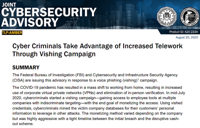 Wired ($): "Phone spearphishing" attacks are on the rise. It's the same attack that saw hackers get access to Twitter's internal admin tool earlier this year. But what exactly is phone spearphishing (also known as vishing)? It's a social engineering attack involving voice calls. The attacker calls a victim using a spoofed phone number and tricks them into handing over passwords or access to internal tools. @a_greenberg reports that vishing attacks have hit banks, cryptocurrency exchanges, and web hosting firms. The FBI and CISA put out warnings about the rise of vishing attacks.