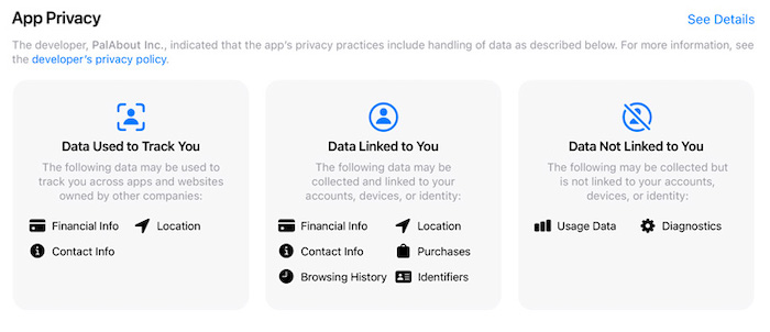 Apple's privacy labels have arrived in the app store, similar to nutrition labels on the side of food except for your personal data. The hope is that it will help users know up-front what kind of data downloaded iOS apps collect on you. "A label might reveal that an app wants to collect your location data, financial details, and contact information, and links all of that to an in-service account or identifiers like your device's ID number," reports @lilyhnewman.