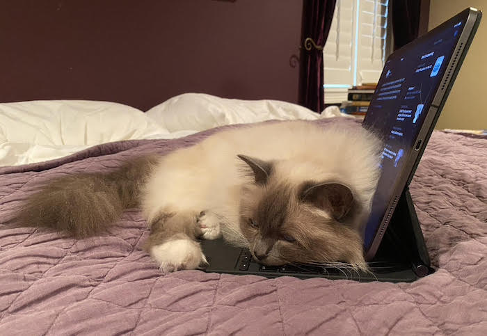This week's cyber cat is Nell T. Blue, who as you can see is taking a much-needed break from fighting misinformation (or "fake mews") about cats. It's a tough job but someone has to do it. A big thanks to Jon C. for the submission!
