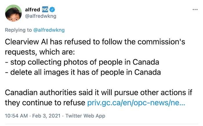 CBC: Canadian privacy commissioners say controversial facial recognition outfit Clearview AI violates the country's privacy laws by collecting faces of Canadians without their permission or knowledge. The company claims to have 3 billion photos in its database, scraped from public social media sites — which have objected and ordered the startup to stop. "What Clearview does, is mass surveillance and it is illegal," federal privacy commissioner Daniel Therrien told reporters Wednesday. "It is an affront to individuals' privacy rights and inflicts broad based harm on all members of society who find themselves continually in a police lineup."