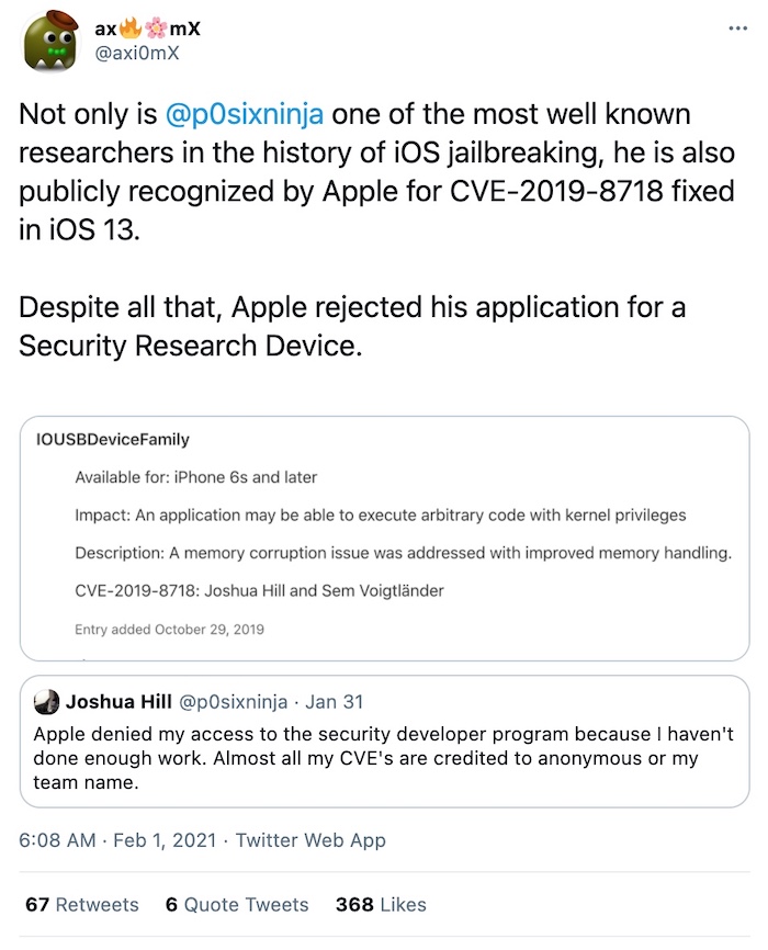 @p0sixninja was denied access to Apple's security research device program in what appears to be a bureaucratic decision, despite being one of the top bug finders. "Apple denied my access to the security developer program because I haven't done enough work. Almost all my CVE's are credited to anonymous or my team name."