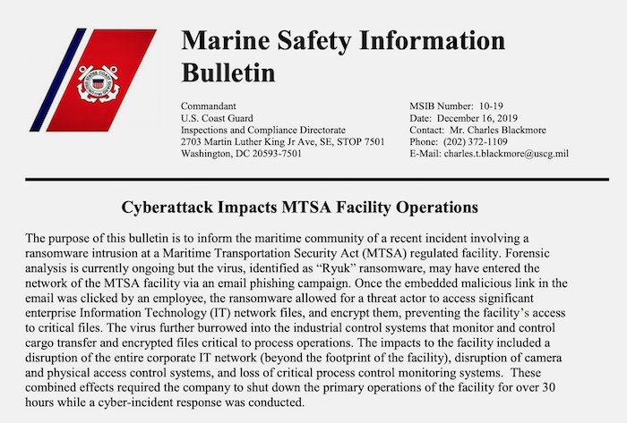 Bleeping Computer: Operations at a U.S. Coast Guard facility shut down for more than 30 hours after Ryuk ransomware struck, according to a Marine Safety Information Bulletin. A phishing email was likely the cause, the bulletin said. Although details are limited, the ransomware reportedly shut down the "entire corporate IT network."