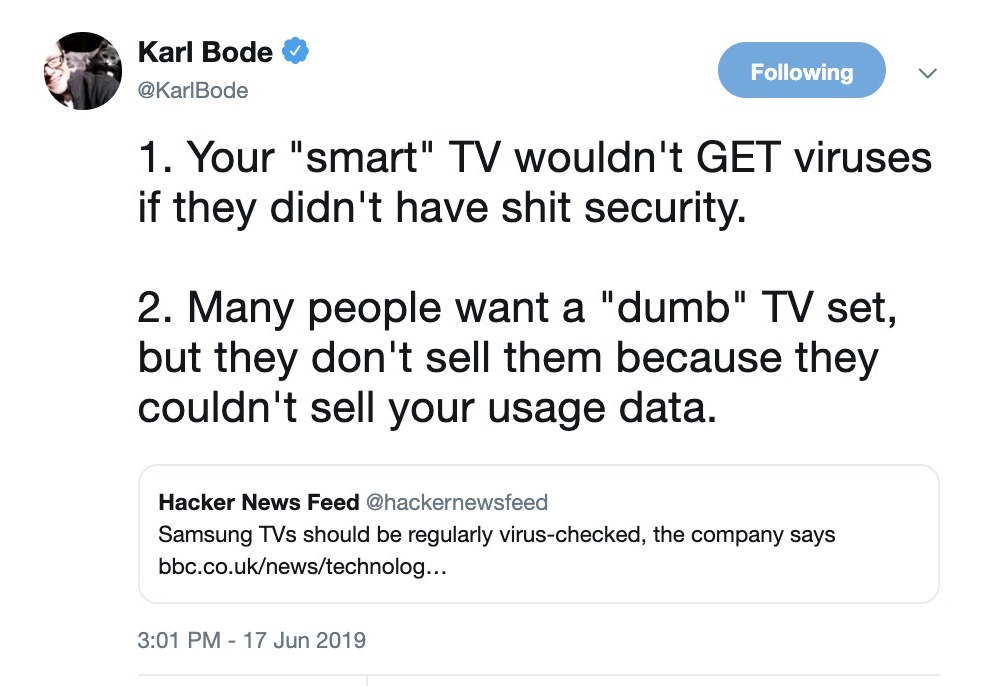Hard to think this happened this week given the amount of news, but yes, this happened. Samsung was 'reminding' smart TV owners in a tweet to run a virus scan on their TVs. Yes, your smart TV can be exploited — the CIA showed that's completely possible — but arguably you only need a smart TV antivirus because Samsung's codebase is so crap. Amid bad headlines, Samsung's social media team pulled the tweet.