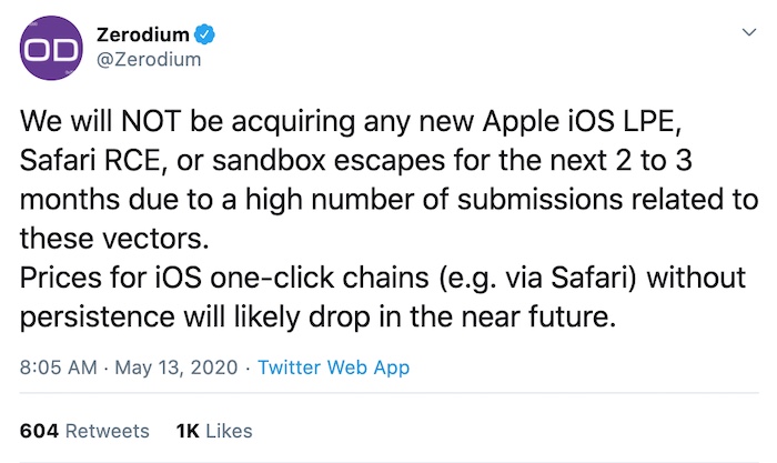 Zerodium: Interesting tweet: Zerodium, a zero-day broker, said it'll stop receiving iOS exploits — local privilege escalations and Safari remote code execution exploits — because of the "high number of submissions." In other words, it has too many. This kicked off a lot of discussion. Initially, some thought iOS was woefully broken — hence the spike in submissions. But @bing_chris and @lorenzofb noted that this doesn't tell the full picture of the exploit market — of course it doesn't. No device is unhackable. But Apple's persistence hasn't exactly helped — it claims it can do no wrong but that just leads to a false sense of security (excuse the pun). Watch this space as this continues to play out.