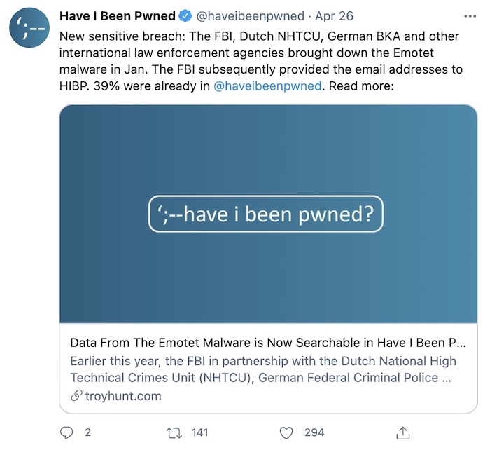 Cyberscoop: Law enforcement have delivered a mass update to the Emotet botnet which they say (hopefully) will neuter it — effectively disinfecting the malware from victim's devices. Emotet is a botnet that has hooks into millions of computers to spread spam and deliver ransomware. Last weekend, authorities sent an virtual antidote to infected devices to wipe Emotet from their machines. It's a controversial (though not the first) use of government powers — even if it worked on this occasion. @lacyactivist192 called it a "huge win" for defenders. Malwarebytes has a good post on how the antidote payload works. Also, the FBI gave a list of email addresses of victims it was struggling to contact to Have I Been Pwned, so now victims can search to see if they are victims. Pretty cool use of the data breach notification site.