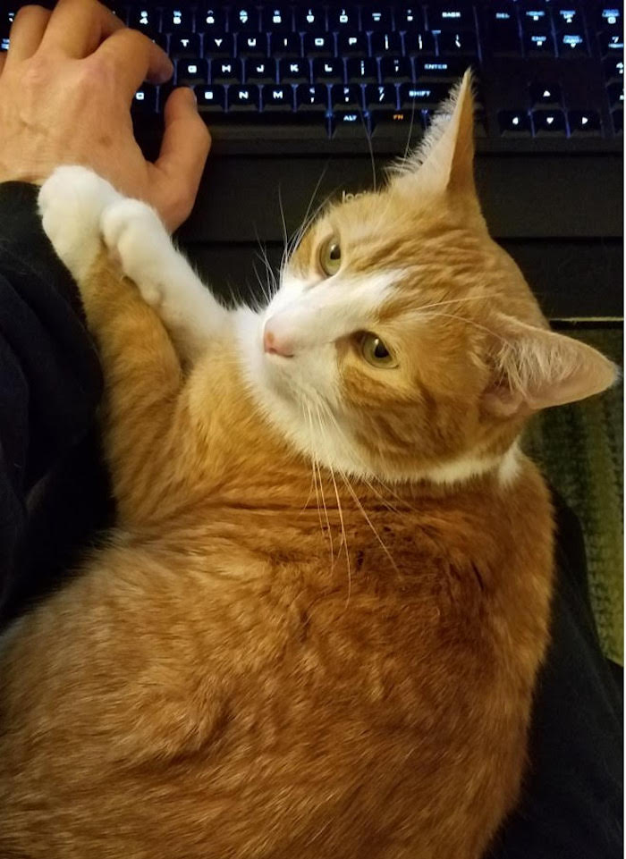 This week's cyber cat is Fitz. When he's not his human's typing assistant, Fitz can be found snoozing on his human's laptop — keeping it safe from the Red Team. You're a very good boy, Fitz. A big thanks to @dr0037 for the submission!