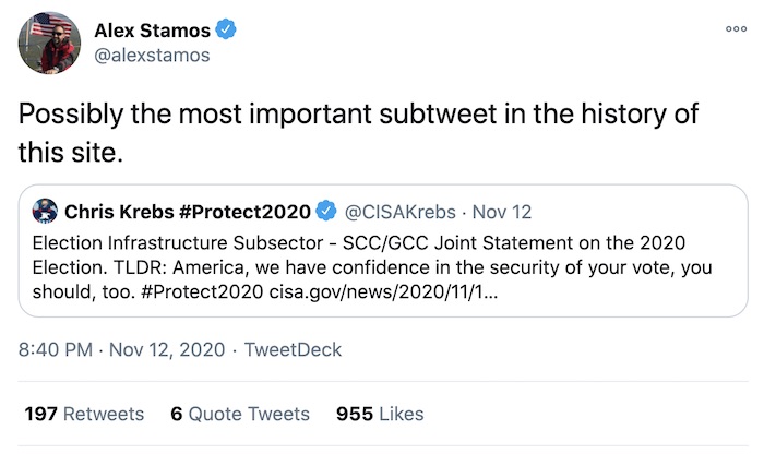 Reuters: Chris Krebs, one of the leading cybersecurity officials in the U.S. government, told colleagues he "expects to be fired" by President Trump because of his efforts to debunk election-related disinformation, much of which has come from inside the White House. Krebs was appointed by Trump in November 2018 to head the new CISA cybersecurity agency, where he's been since. In a statement this week, CISA doubled down on its assertion that there is "no evidence that any voting system deleted or lost votes, changed votes, or was in any way compromised," in what @alexstamos called the "most important subtweet in the history" of Twitter. Lawmakers, including Ron Wyden and Mark Warner — two members of the Senate Intelligence Committee — came to Krebs' defense this week, saying he was "respected by everyone on both sides of the aisle." But, Krebs hasn't yet been fired (that we know of) at the time of writing.