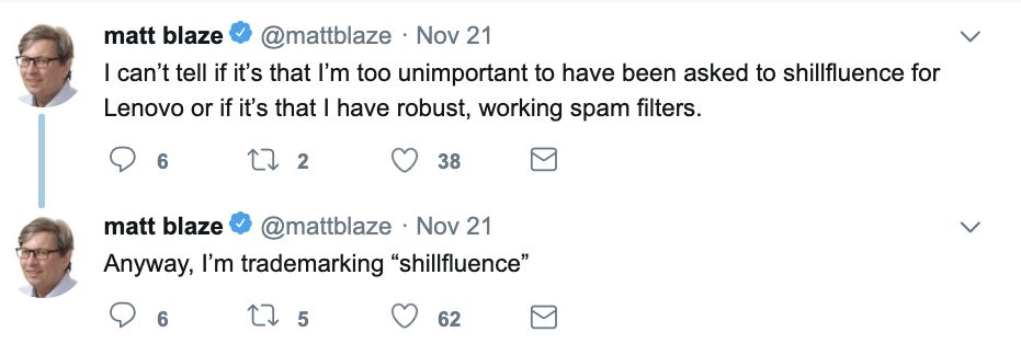 Axios: VizSense, working on behalf of Lenovo, was caught paying so-called cybersecurity "influencers" to promote one of its endpoint security products for paid tweets. Nobody actually examined the product or validated Lenovo's claims, but still took Lenovo's money. The vast majority of those they asked turned down the request — including myself — on ethical grounds. Ironically, most people had never heard of these so-called "influencers".