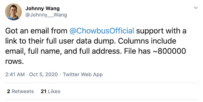 Well that was awkward: a hacker broke into the systems of food delivery service Chowbus, collected 800,000 rows of customer data, and emailed the data to its customers from the company's own SendGrid account. Brazen. The data included customer names, email and postal addresses, and more. Later in the day, Chowbus emailed its users — without an apology. @haveibeenpwned loaded the data — and it contained about 444,000 unique email addresses, 58% of which were already in its database.